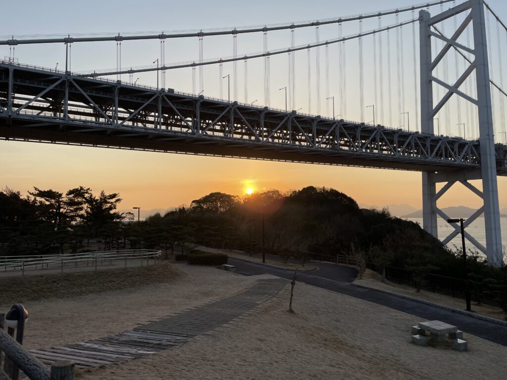 そしてもう1つ見ておきたいのが、朝日。与島はとても小さな島なので、朝日も夕日も見ることができるんです。朝早く起きて小高い丘に上ると、瀬戸大橋の向こう側に昇る朝日を見ることができました。