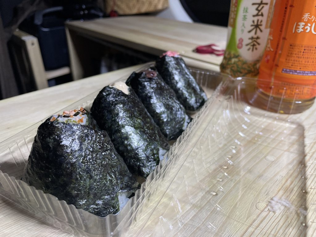 今回食べたおにぎりたち。手前から、梅しょうが、ツナマヨ、ホタルイカ、焼きたらこ。特に美味しかったのは、ホタルイカ。少しかじると、中から大量のホタルイカが溢れてきます。