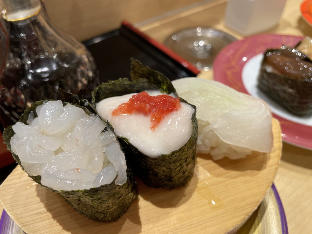すしのやさんは回転寿司ですが、今回お邪魔したときには時間が早かったこともありネタは回っておらず、注文してその場で握ってもらえました(紙の伝票に鉛筆で書き込むスタイルで、ついつい多めに注文してしまいました…)。